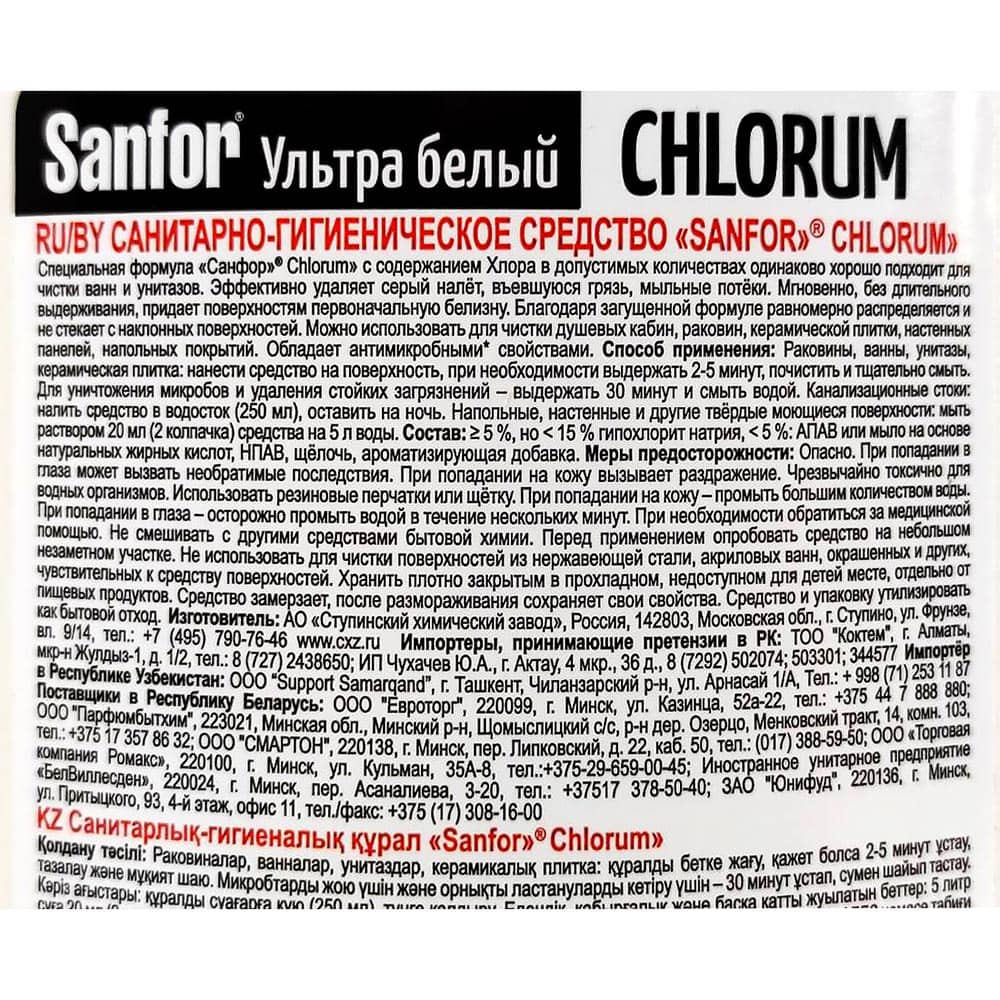Средство санитарно-гигиеническое универсальное Санфор «Хлорум. Ультра белый» предназначено для очистки и дезинфекции ванн, раковин, душевых кабинок, унитазов, сливов, водостоков, керамической плитки и многого другого.